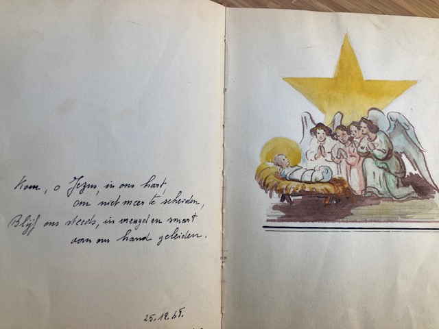 Voorzichtig opende ik het kleinood. Mijn hart sloeg over. Gekrulde letters omringd door een haag van groene hulst: Poésie, eronder de naam van Marie, de moeder van mijn man. Op de eerste bladzijde een kersttafereel met felle ster en goudgele kribbe, 25 december 1945. Ik bladerde verder. Krachtige kreten uit een naoorlogse periode, tekeningen van vazen vol bloemen, gedichten van Guido Gezelle, aandenken aan de heerlijke uurtjes bij de cumuls. Sint-Andries, 1949.