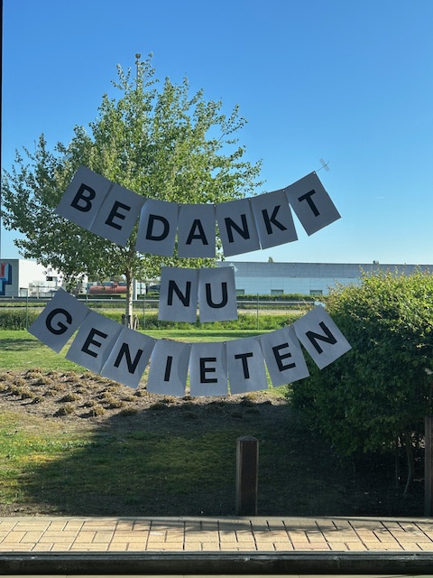Een laatste werkdag om nooit te vergeten. Een warme ontvangst met ontbijt, prachtige geschenken, een living vol bloemen.